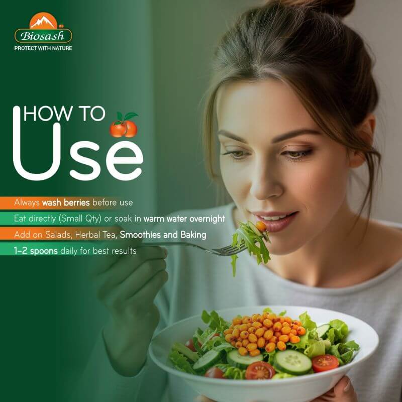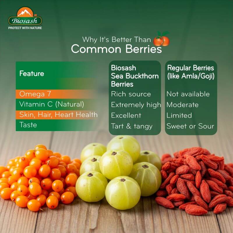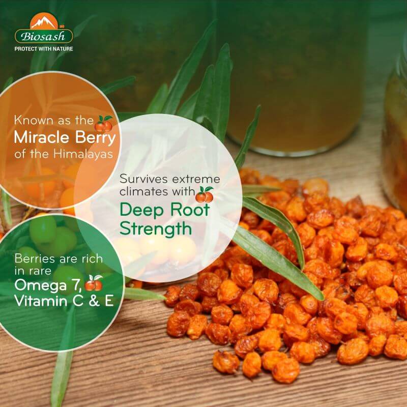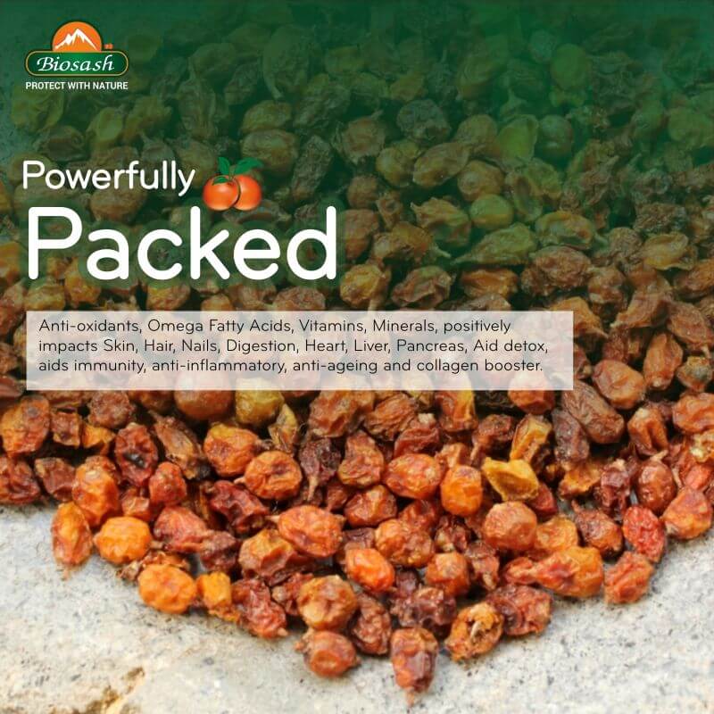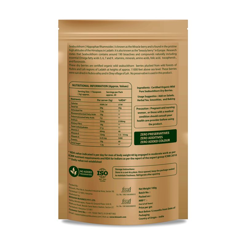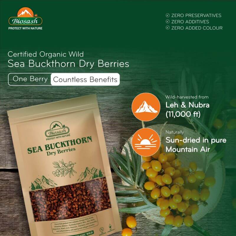 Certified Organic Wild Sea buckthorn Dry Berries Sea buckthorn (Hippophae Rhamnoides) is known as the Miracle berry and is found in the pristine high altitudes of the Himalayas in Ladakh. It is also known as the “beauty berry “in Europe. Research states that Sea buckthorn contains around 190 bio actives and compounds naturally including essential Omega fatty acids 3, 6, 7 and 9, vitamins, minerals, amino acids, folic acid, tocopherols, and flavonoids. These dry berries are certified organic wild sea buckthorn berries plucked from wild forests of Nubra and Leh regions of Ladakh at heights of approx. 11000 feet above sea level. These berries were sun dried in Nubra valley and in Shey village of Leh. No preservative is used in this product.